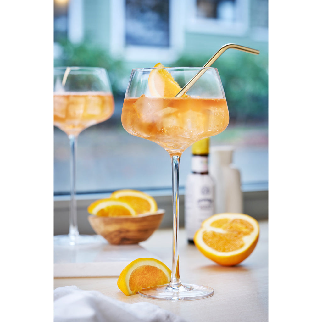 Synonymous with summer but enjoyed year-round, the amaro spritz is best mixed with a generous serving of ice. This elegant glass is crafted specifically with the cocktail in mind: the volume allows for the perfect ratio of each ingredient, from start to garnish. With their sleek design and elevated stems, this set of cocktail glasses feels as good in your hand as they look on your bar.